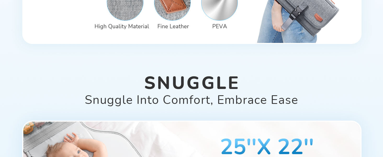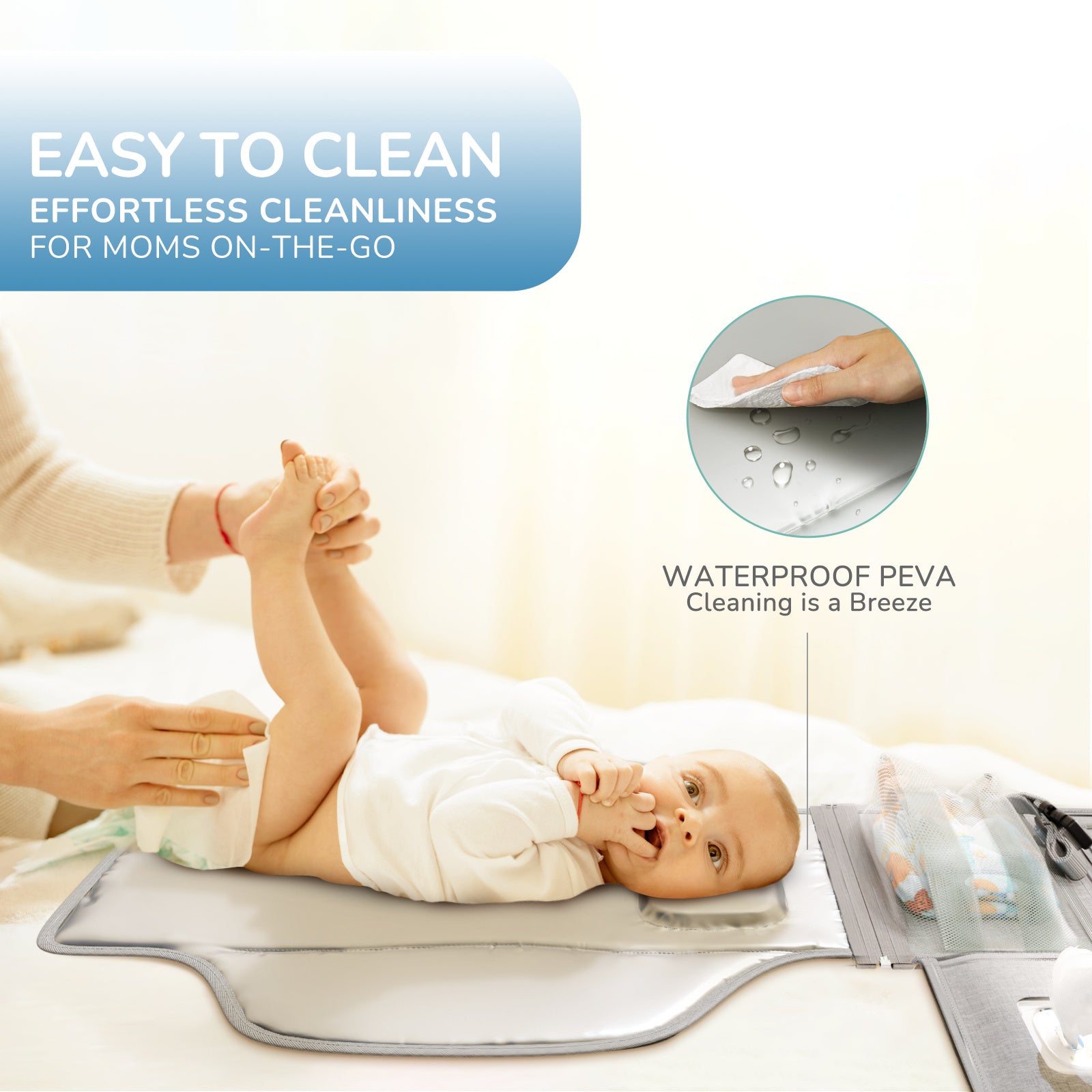 - EASY TO CLEAN AND COMFY FOR BABY; The Alatino Portable Changing Pad is made of premium materials The high-quality padded surface features a built-in ½ inch memory foam pillow to cushion your baby’s head; Also, the waterproof material surface makes it easy to clean with a quick wipe down when messes happen